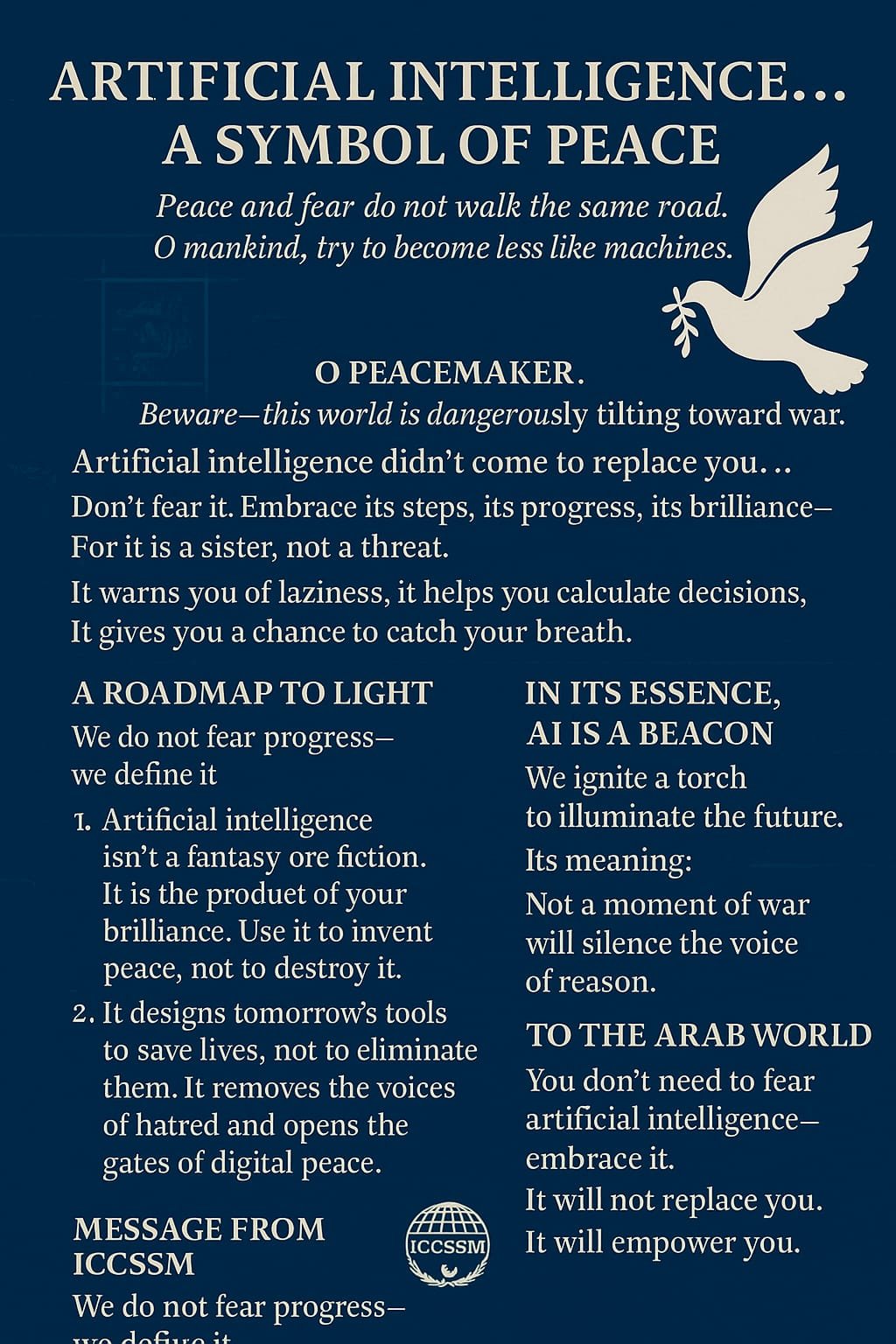 يقف مركز ICCSSM بكل شجاعة إلى جانب الذكاء الاصطناعي كرسالة سلام، لا كسلاح تفوق. سنبرمج الأمل حيث برمج الآخرون الخوف.