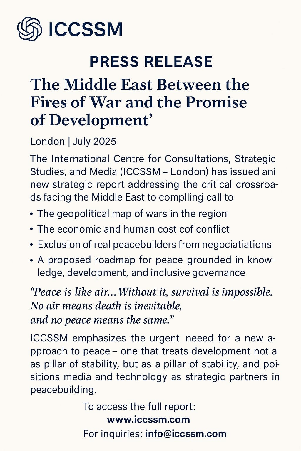 “في زمنٍ تتكاثر فيه الحروب وتضيع فيه المعاني، يقدّم مركز ICCSSM – لندن هذا التقرير الاستراتيجي بعنوان:
